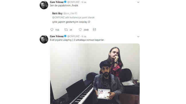 Piyanonun yerine ulaştığını sosyal medya hesabından duyuran Cem Yılmaz, bir takipçisinin “İyilik yaptım, göstereyim” yorumuna, esprili bir dille, “Sen de yapabilirsin fındık” yanıtını veren Yılmaz’ın cevabı takipçilerini güldürdü.